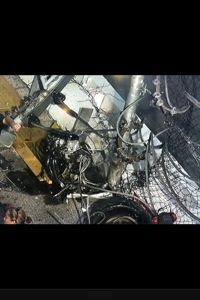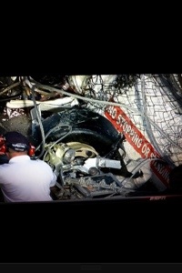 The impact caused material to soar into various places, some of it reaching the second level of the stands about 20 feet up. An engine was among the parts that broke loose and plowed into the protective fence separating the track from spectators.