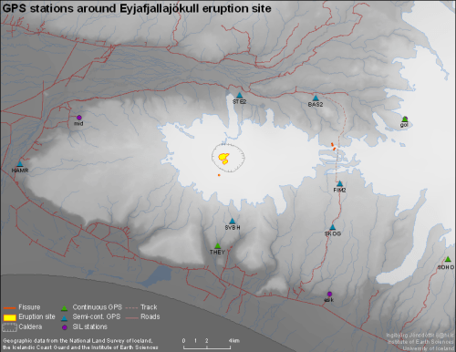 Two new sites were installed in the two days prior to the eruption on Fimmvörðuháls (20. March), FIM2, a quadripod station on Fimmvörðuháls, and BAS2, steel rod in Básar. Another steel rod site, SVBH, was installed north of THEY and closer to the summit crater on the 15. April, day after it started erupting.