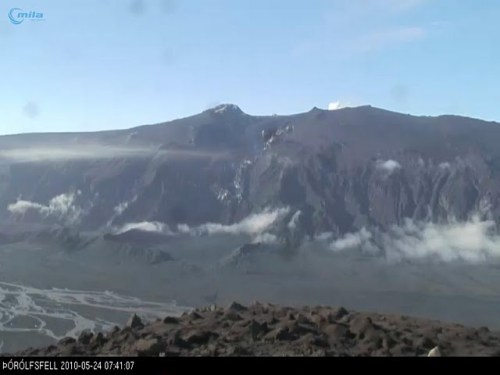 There is no ashfall being reported although there is still some steam and the earthquakes have subsided a bit. We are still seeing seismic activity creeping towards Katla as we reported previously this week at https://ahrcanum.wordpress.com/2010/05/22/icelands-katla-volcano-recent-earthquakes/ There were two mild tremors detected in the last 24 hours near the Katla volcano.