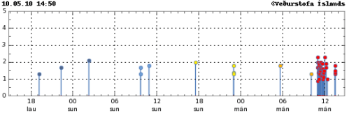Although 4 or 5 earthquakes at the volcano site in 4 days does not indicate a drastic change in pattern, the interesting notation at the moment is the fact that the two most recent earthquakes occurred within 3 hours of each other on 21 May, 2010, at depths of 5km and 13km. That in itself is an increase in occurrence. It may be an anomaly, but it justifies keeping one eye on Katla, the big sister of Eyjafjallajokull.