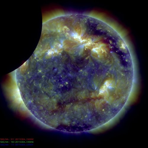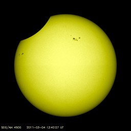 SDO, Solar Dynamics Observatory observed a lunar transit or eclipse. Date stamp is March 4, 2011. Incredible images of the eclipse are from http://sdo.gsfc.nasa.gov/